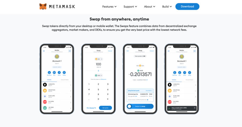 Meta-Mask also offers direct support when it comes to conversion of tokens between most coins based off of Ethereum blockchain technology.