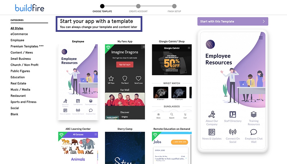 Their app maker lets you build an Android and iPhone app without any coding knowledge. All you have to do is pick a template, add your features, and publish it!