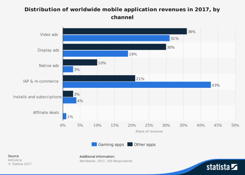 Apps in the gaming, social, and entertainment categories rely heavily on this form of revenue since they’re typically free apps to download.