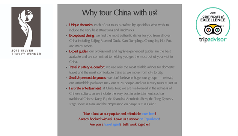 Check out this website for a China tours company. Right off the bat you can see an issue with the text on the page—a gray background with gray text. There isn’t much contrast here and it makes the content hard to read. Additionally, the red and blue in that same section do not compliment each other.