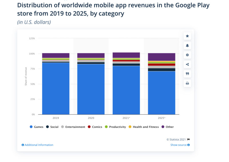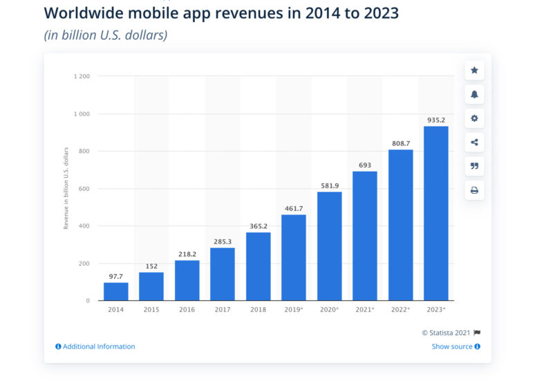 In 2020, people downloaded 218 billion mobile apps. According to the same research, the yearly revenue of mobile apps totals around $462 billion.