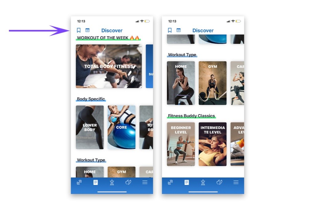 If you’re not sure where to start, their Discover page offers a Workout of the Week exercise as well as workout categories, like workout type, body specific workouts, and Fitness Buddy classics.