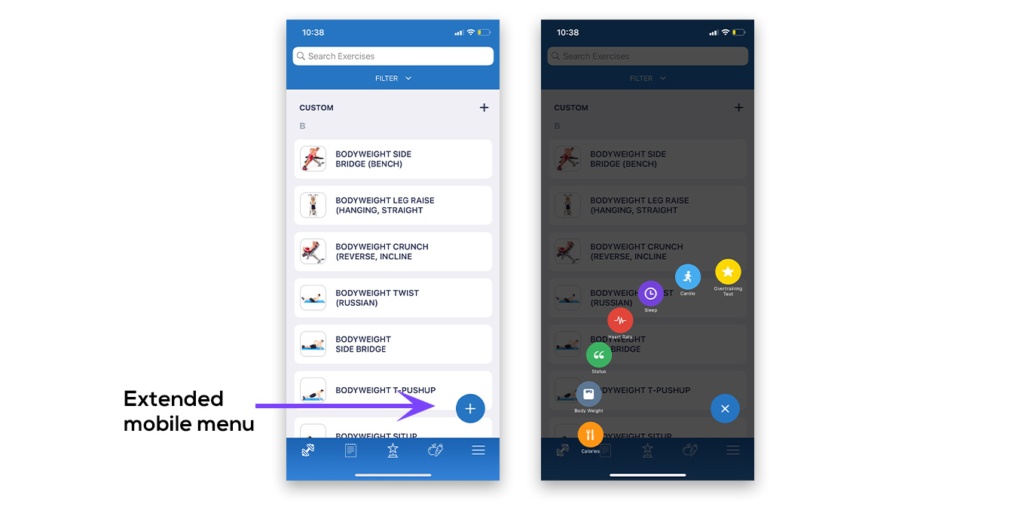 Fitness Buddy keeps things pretty standard by including a menu bar at the bottom of the screen. You can also click on the large plus sign button to open up more menu options.