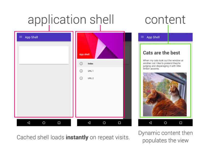 This shell is made up of HTML, CSS, and JavaScript and powers the UI. It also caches so that the shell doesn’t need to be loaded each time a user visits the app.
